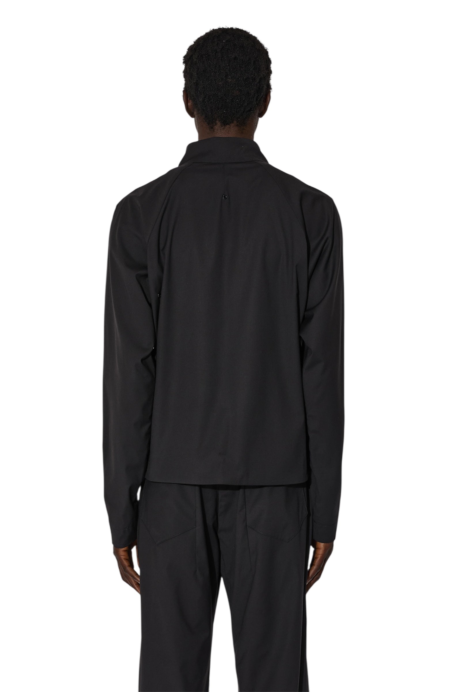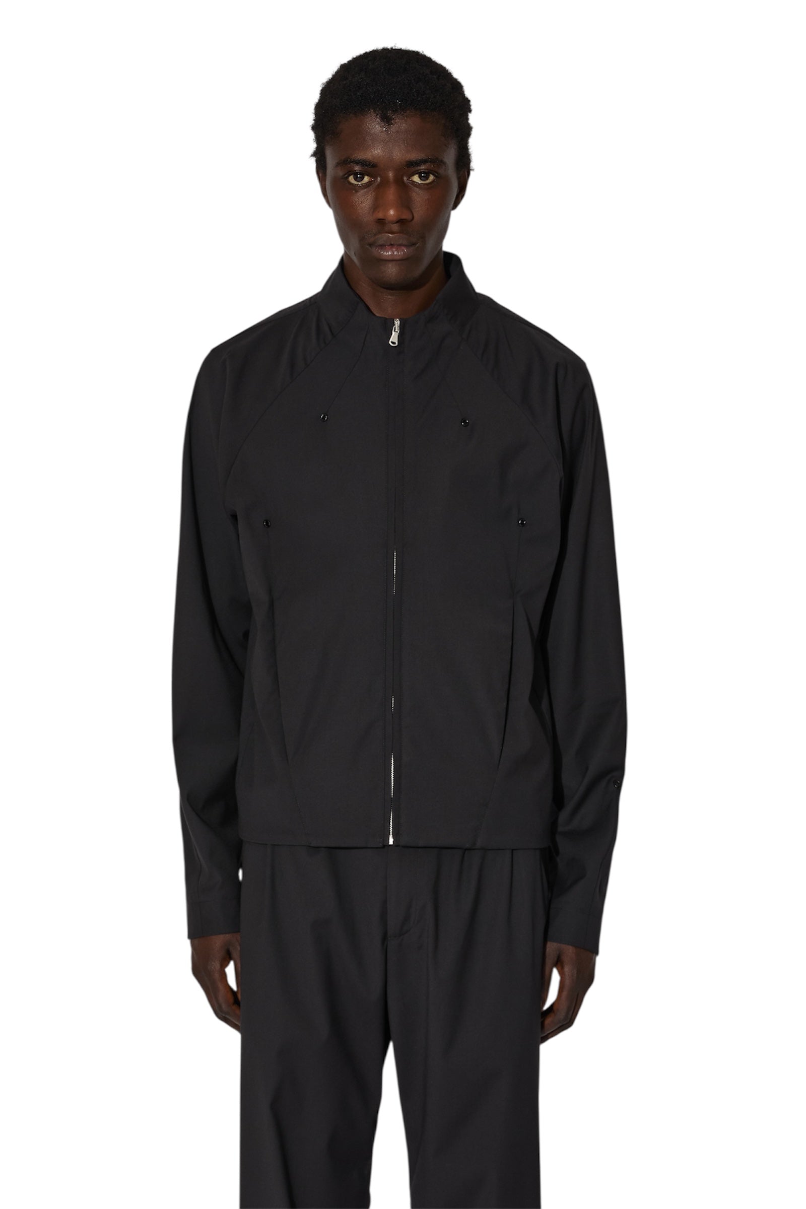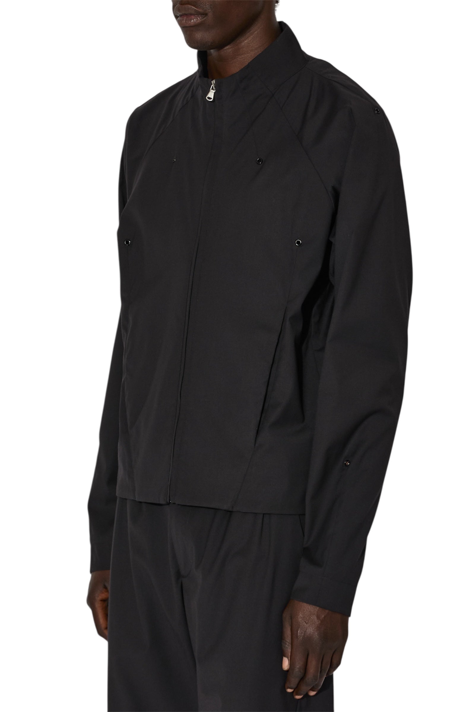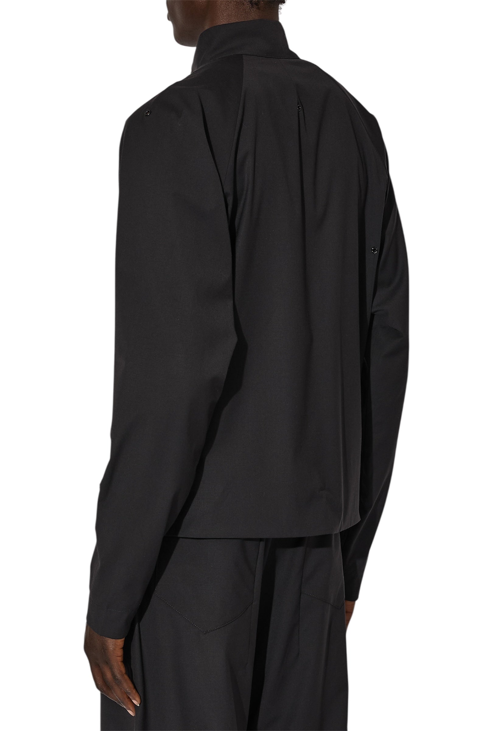 JLALのコアシルエットを進化させたMitre Jacketは、ハリのあるポリエステル素材を使用しています。