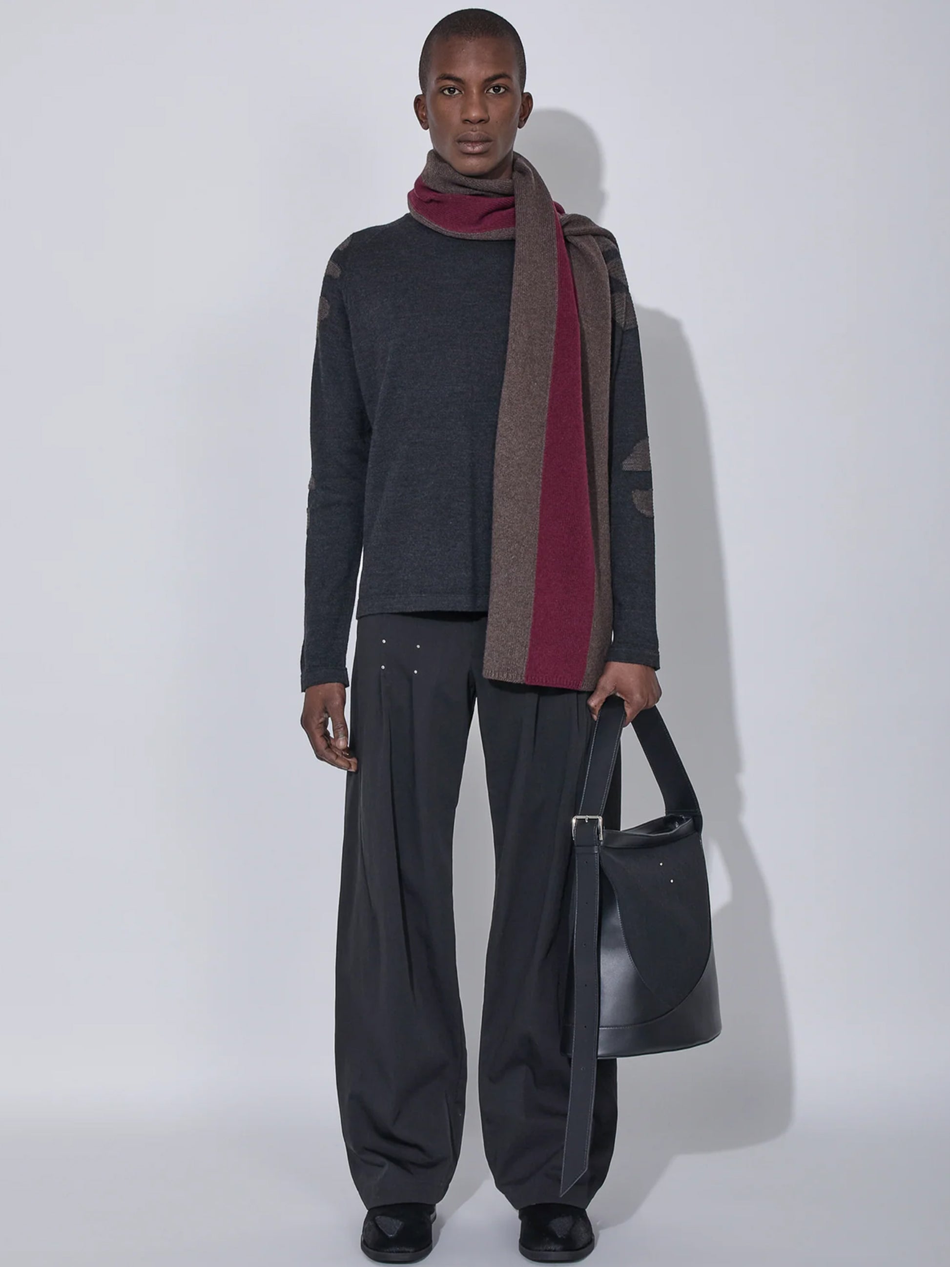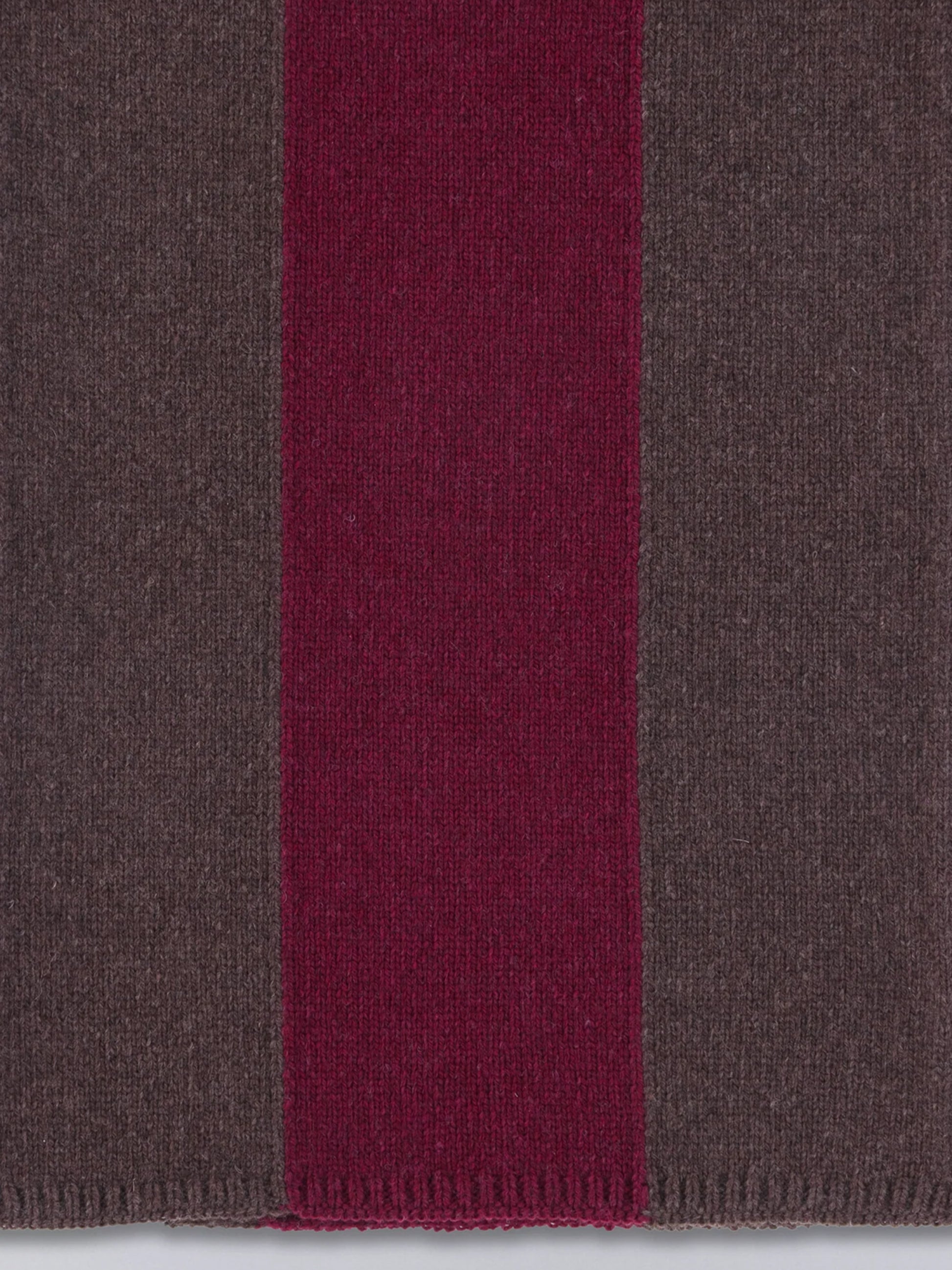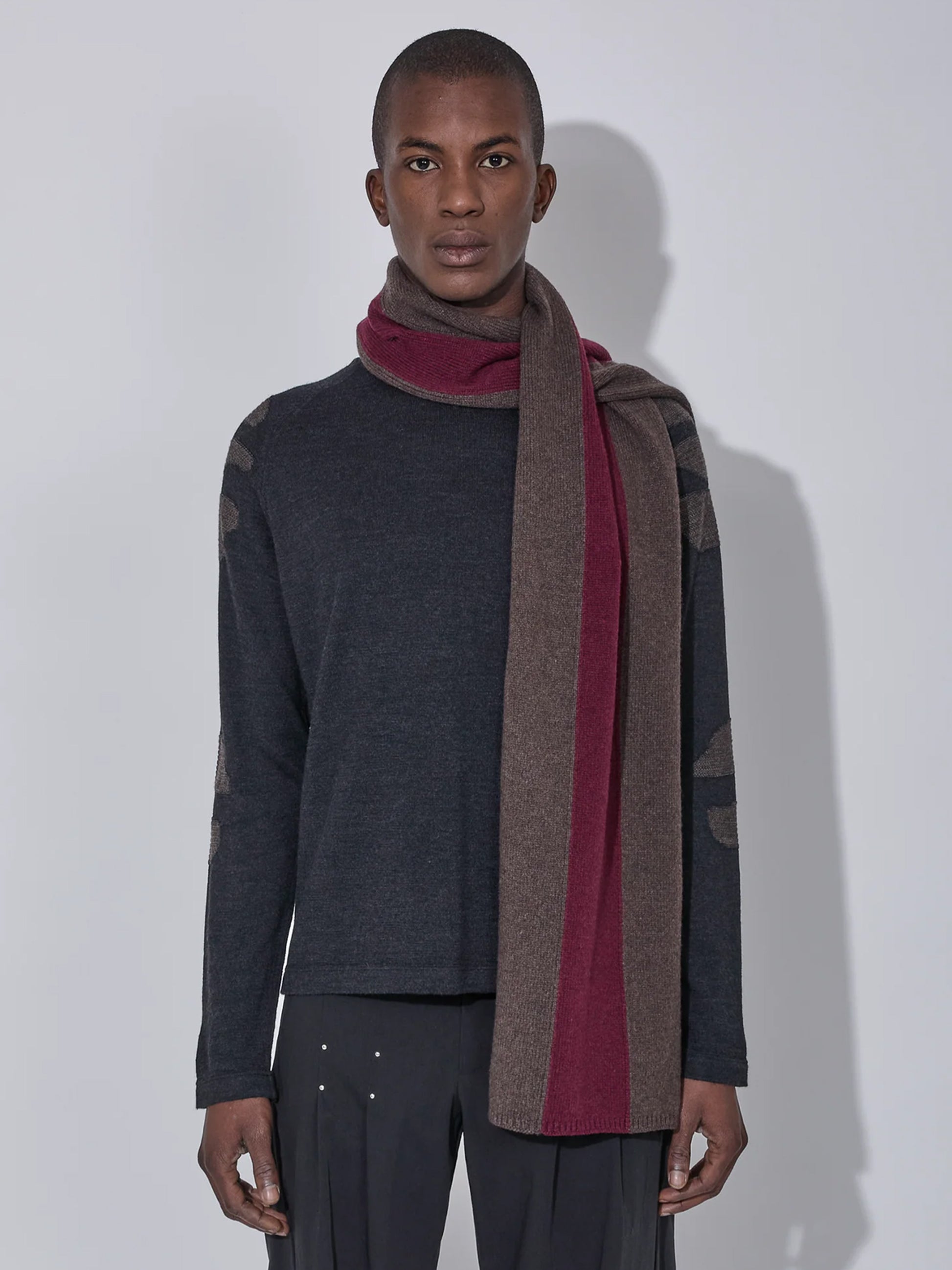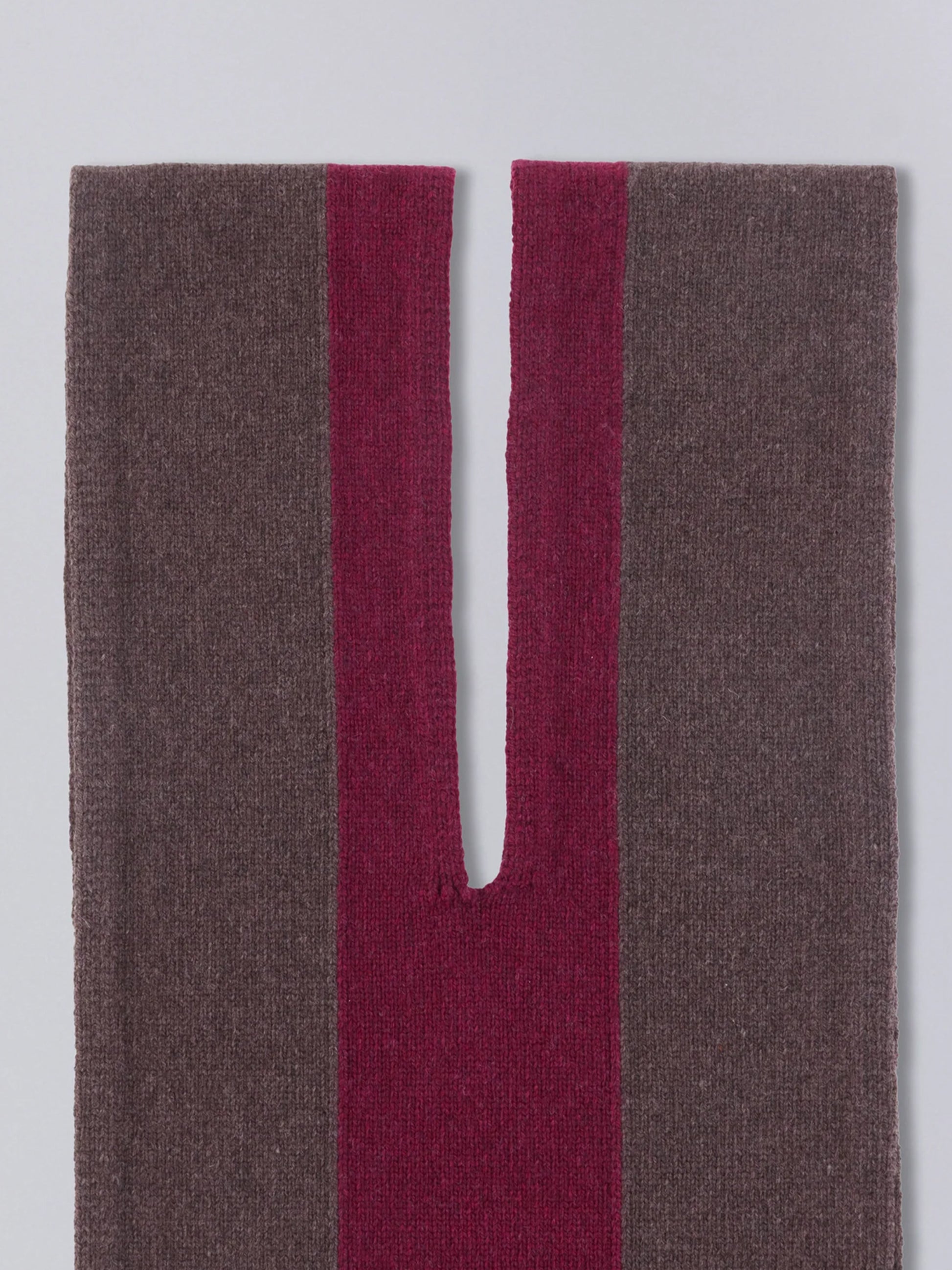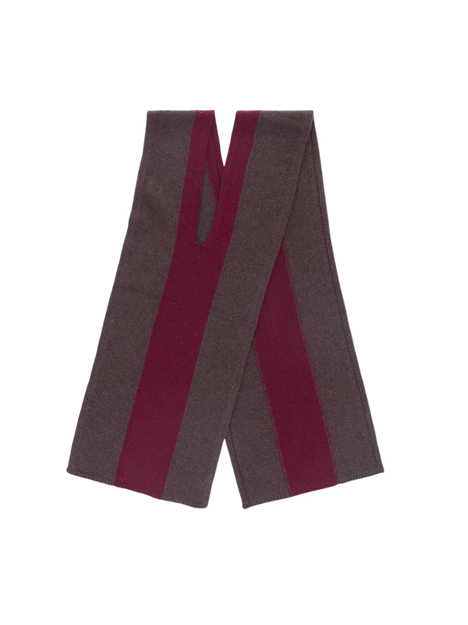 ウール糸で作られた Terr スカーフは、コントラストのストライプと中央のスリットが特徴で、