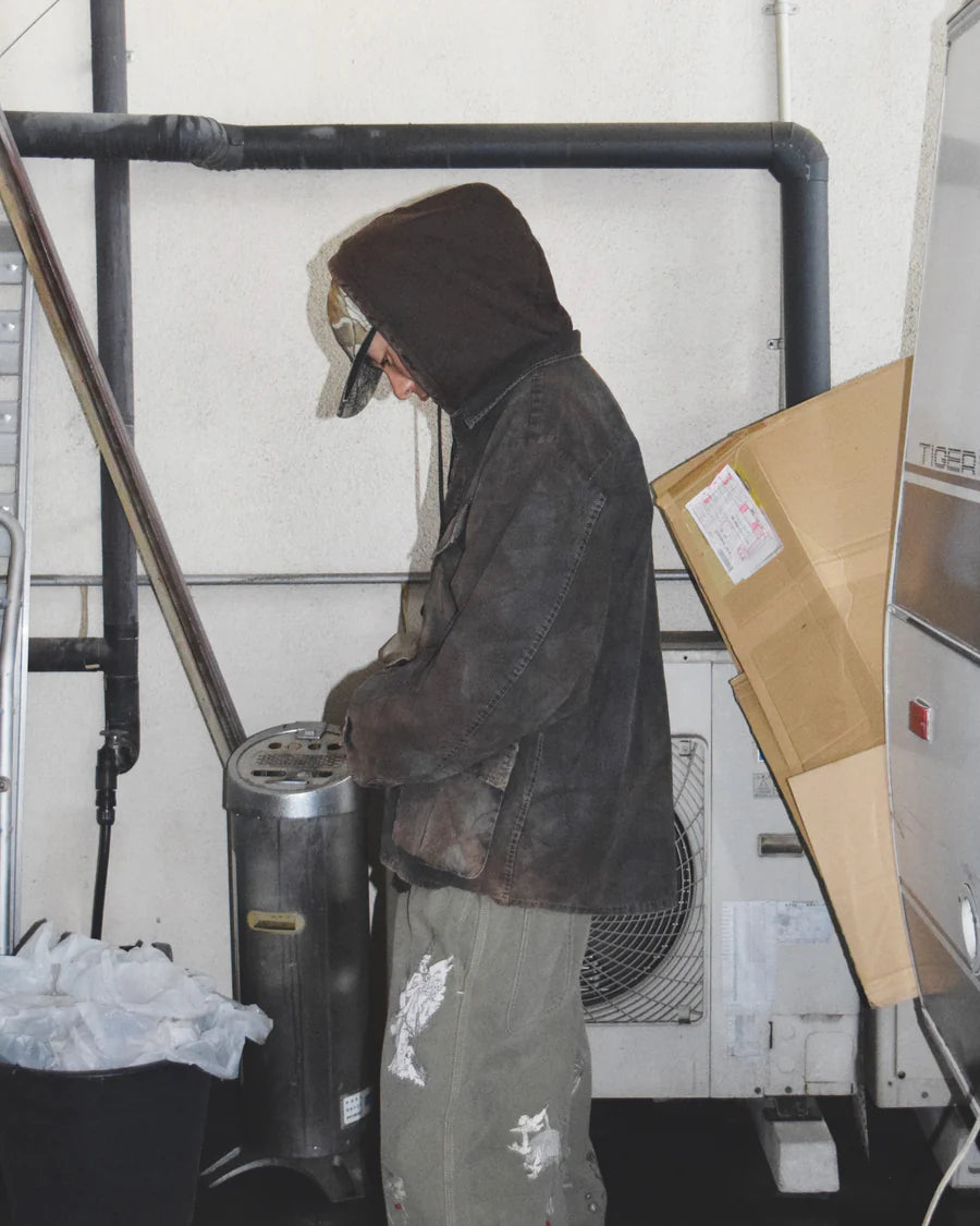 硫化染料による製品染め後、全く水を使用しない特殊なブリーチ加工を施しております。