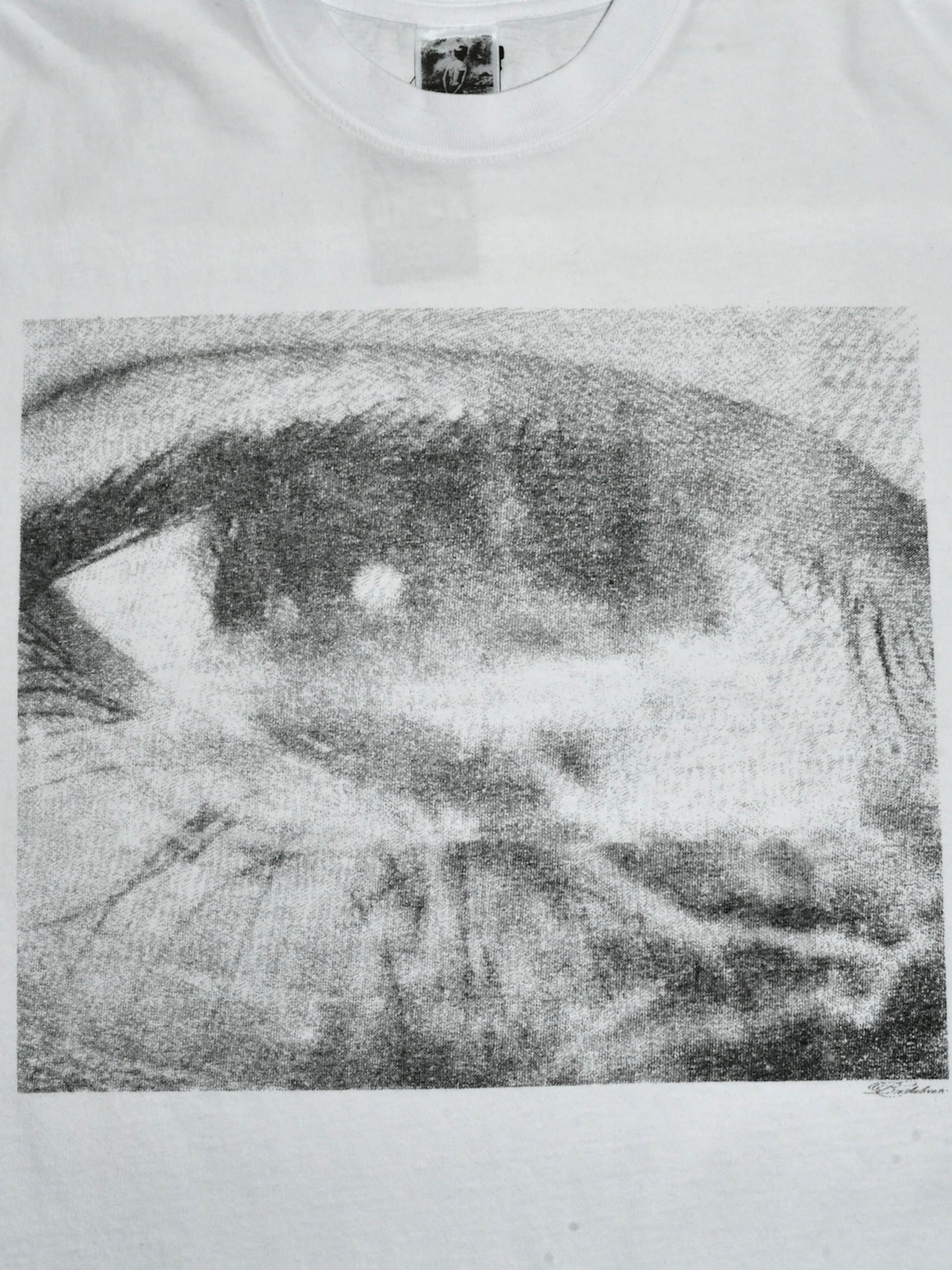 フロントに大きく目のプリントがされているTシャツ。
