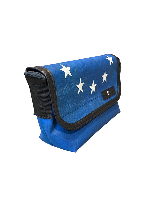 アップサイクルされたトラックの防水シートから作られたアイコニックなミディアムサイズのメッセンジャーバッグです。