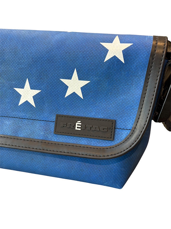 調節可能なストラップ、バッグの前面には、É シグネチャー、Europa ロゴ、FREITAG ロゴを組み合わせた専用ロゴがあしらわれています。