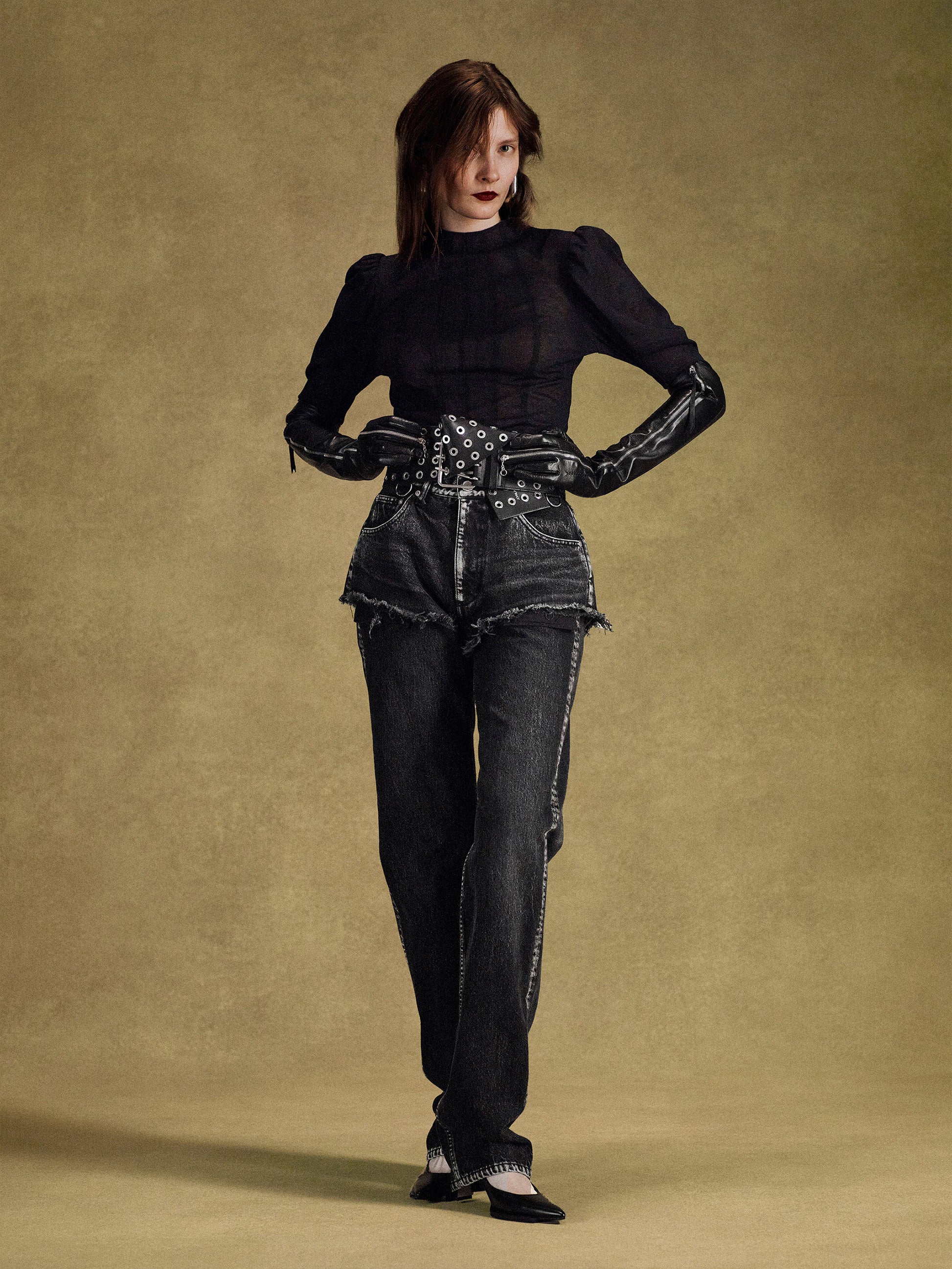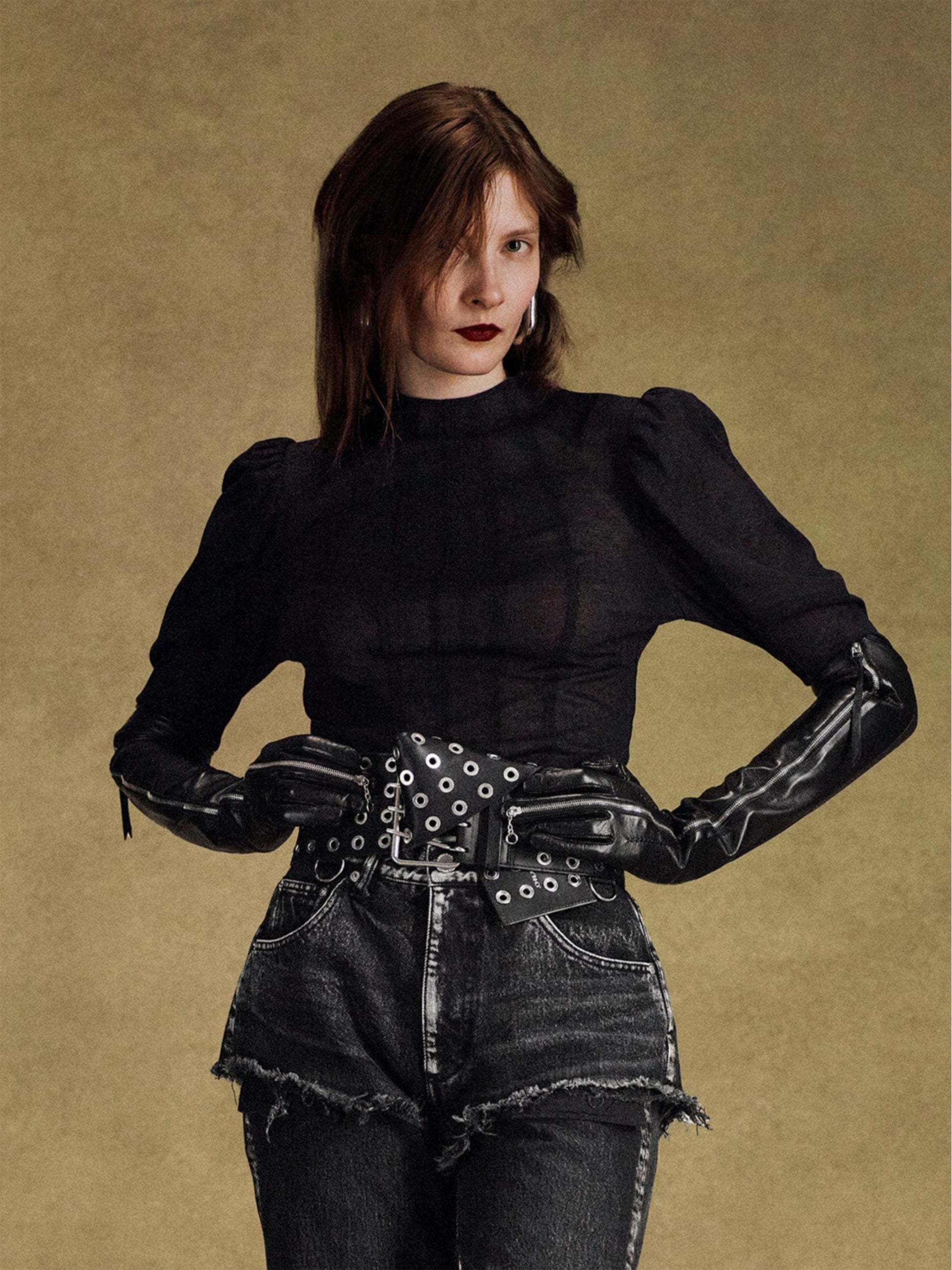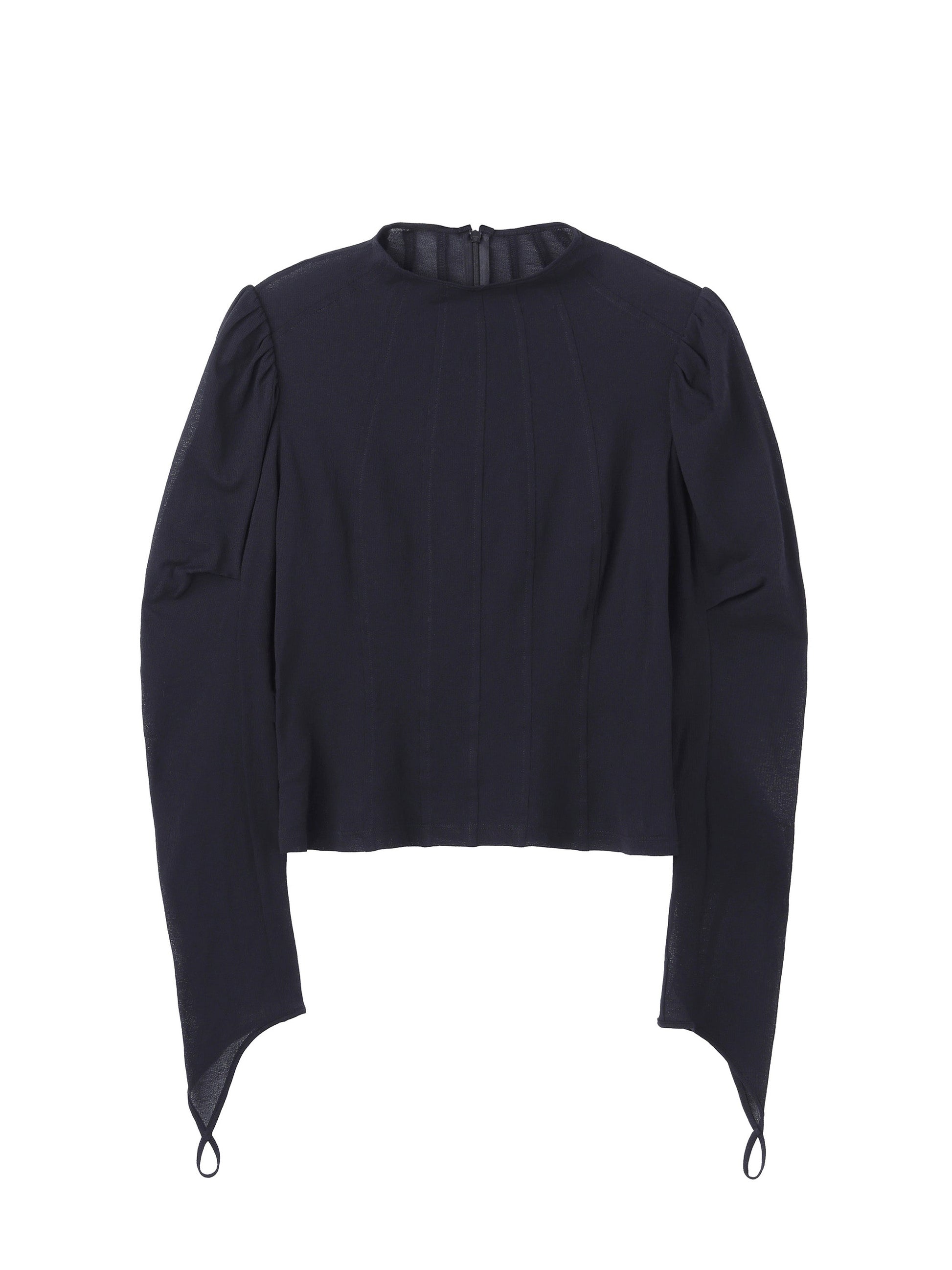 コルセットを思わせる様な身頃のカットラインとボリュームのあるタックパフスリーブが特徴的なモックネックトップス。