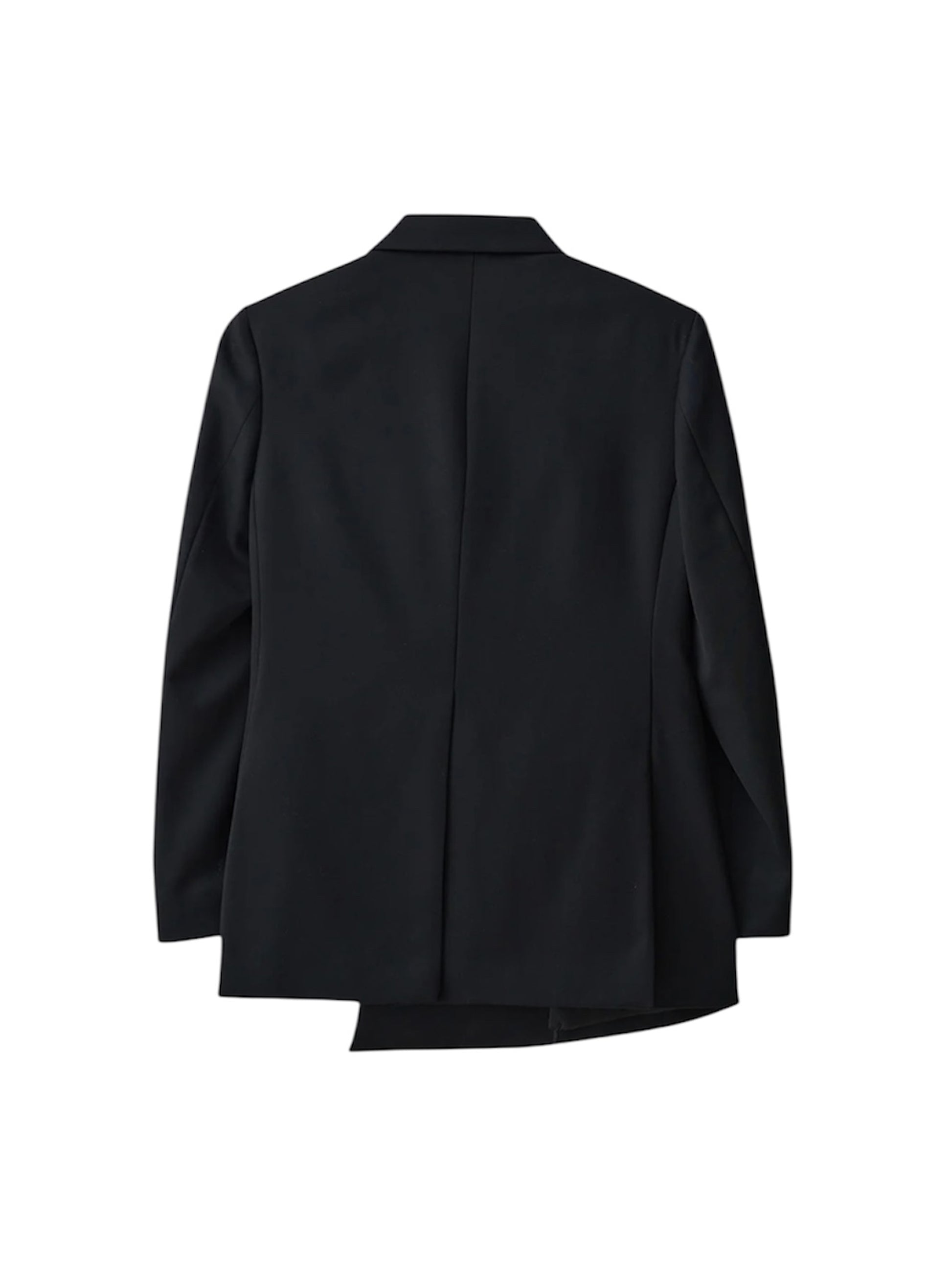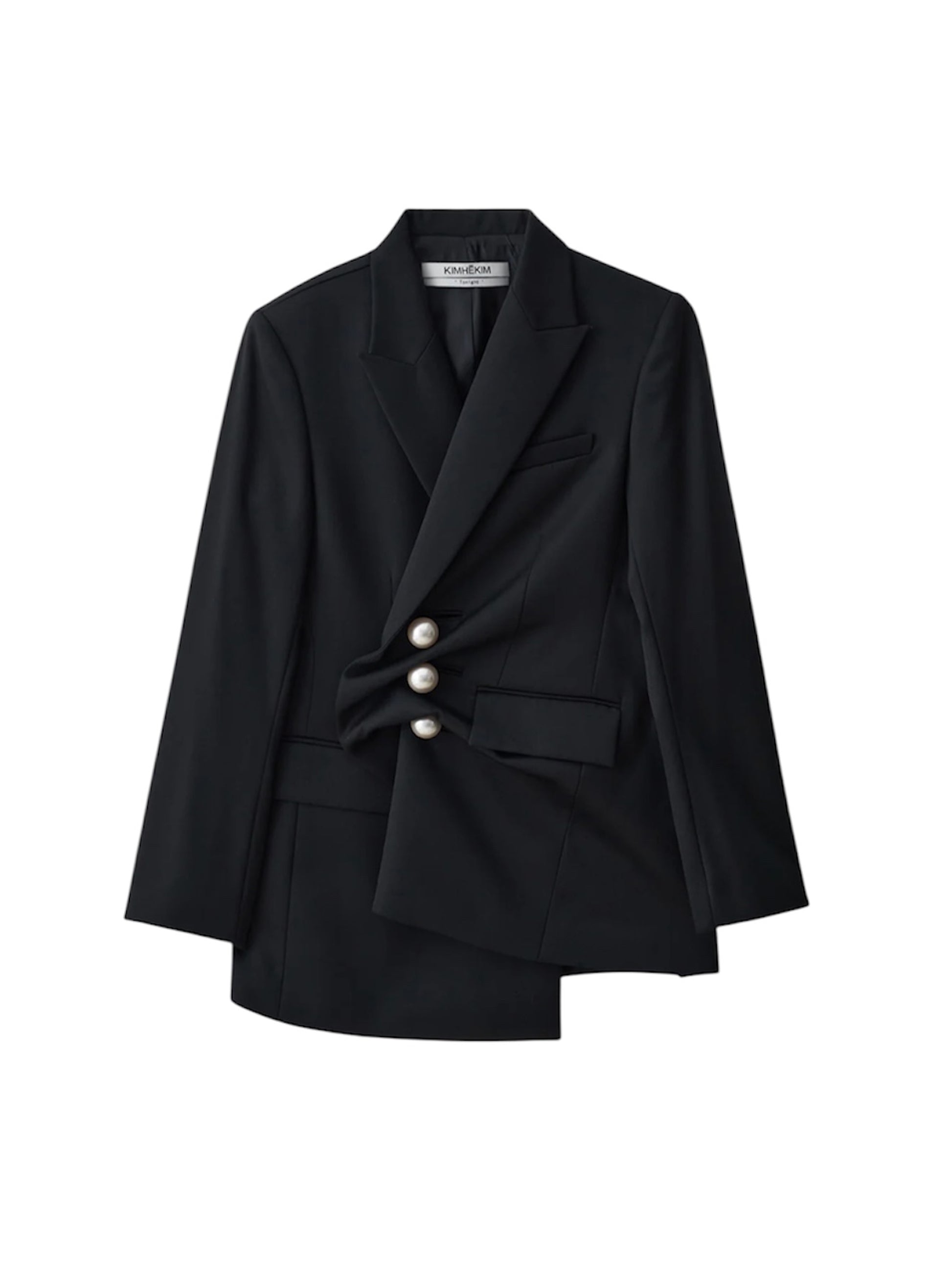 ややゆったりとしたフィット感で仕立てられており、パールボタンで留めると、ドレープのかかったアシンメトリーな構造が際立ちます。
