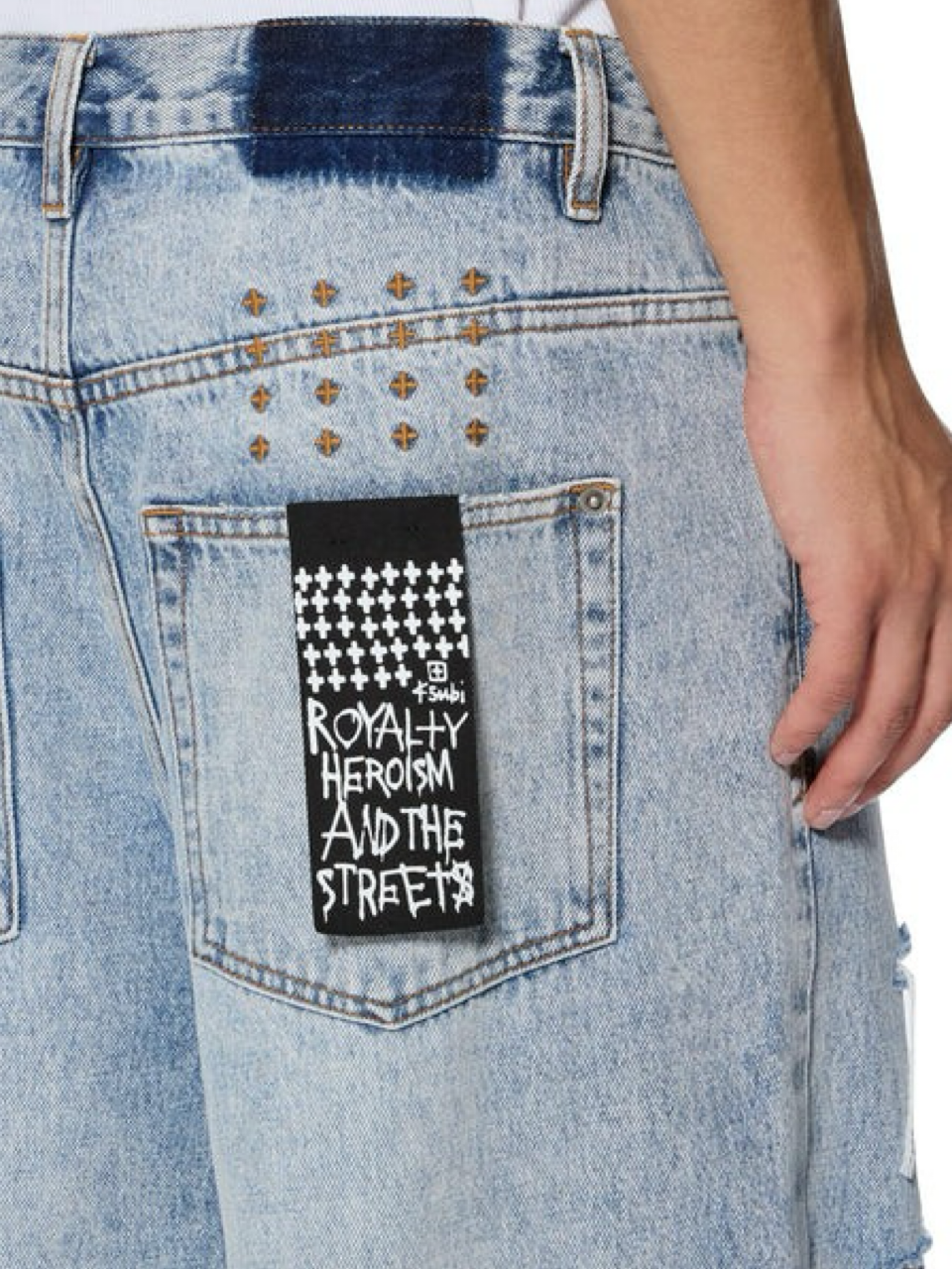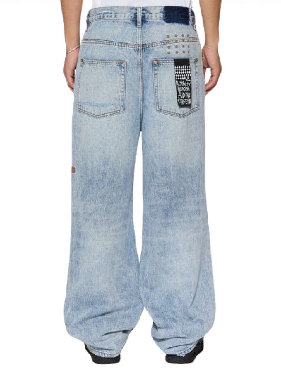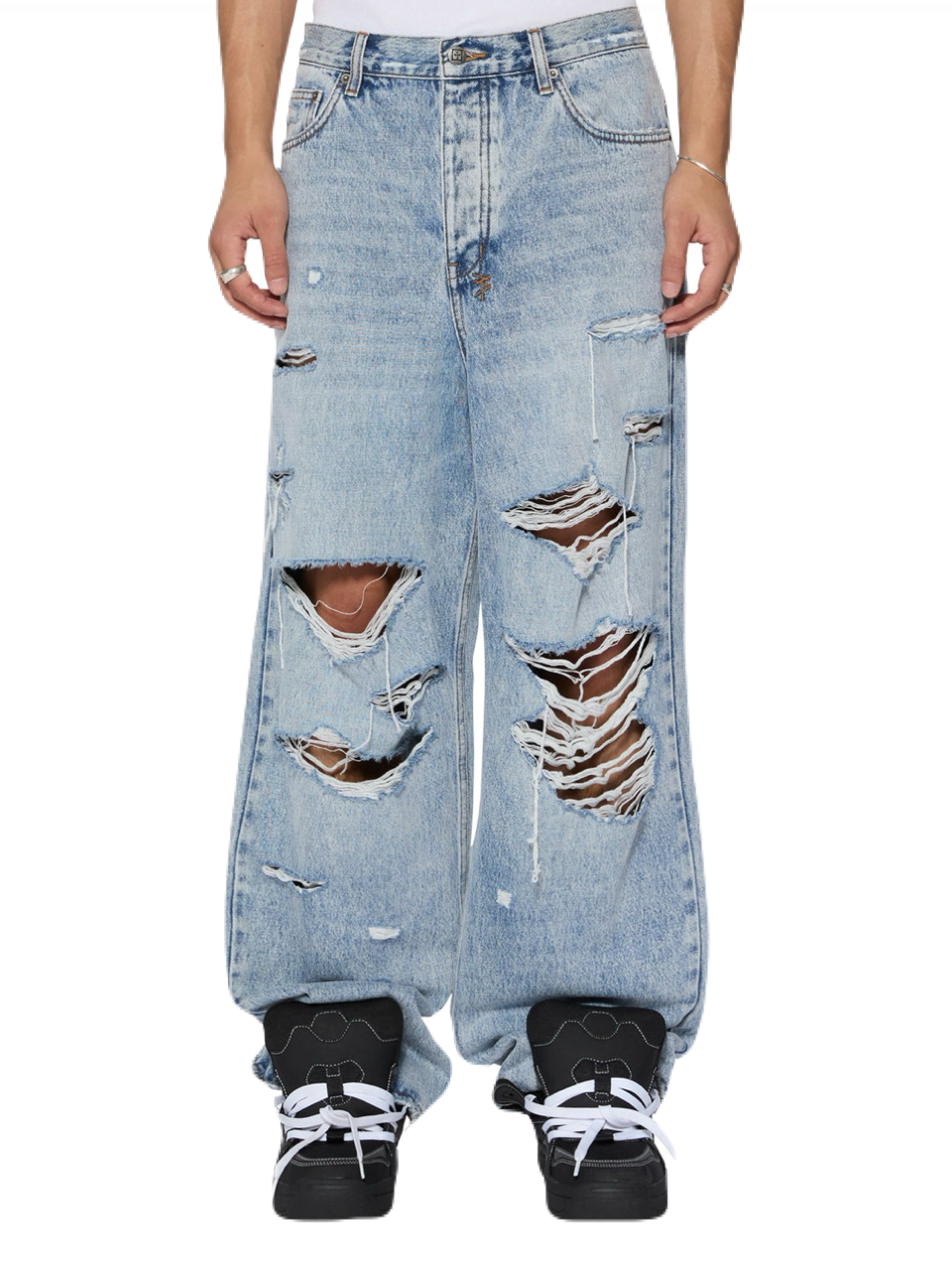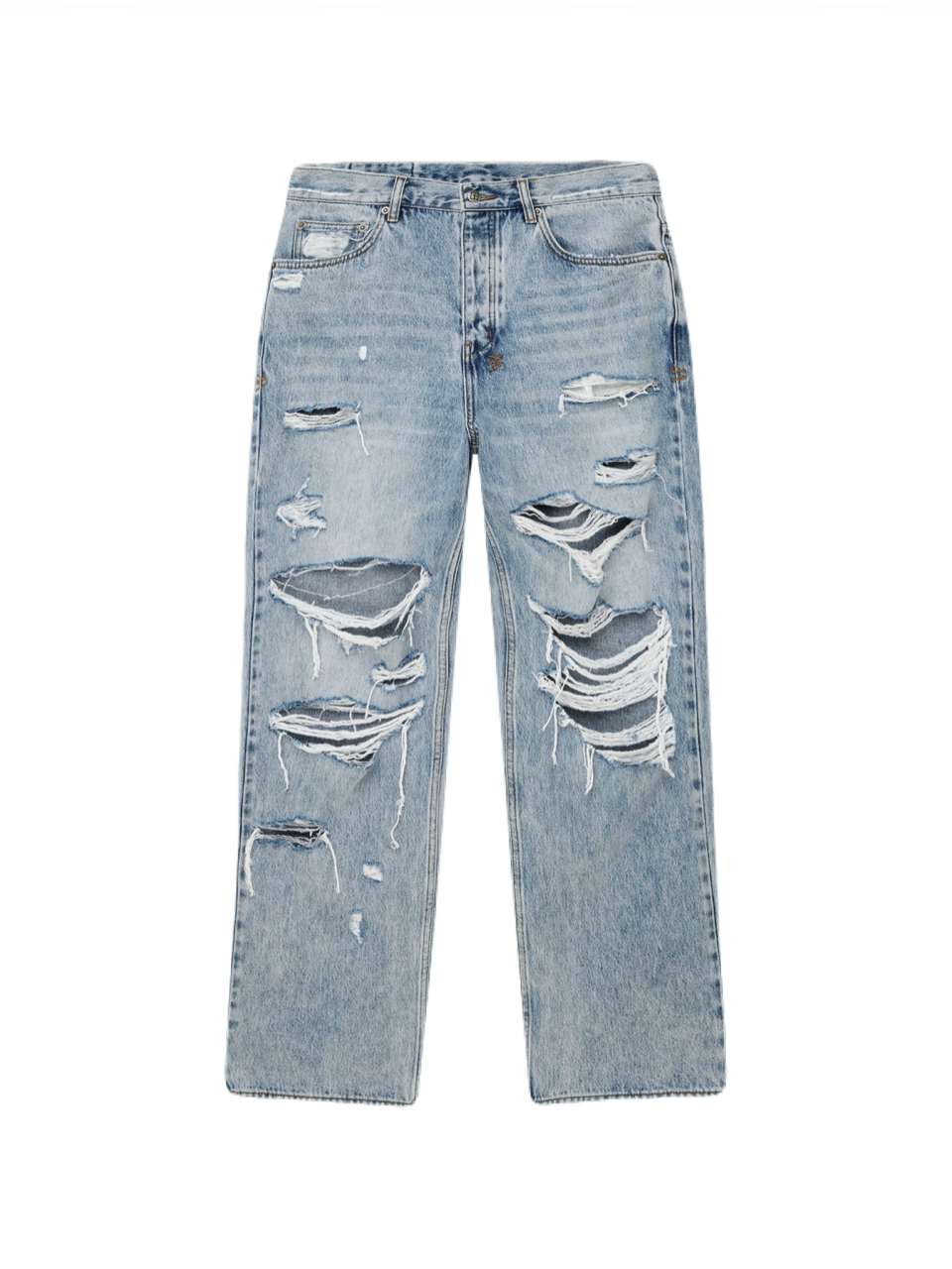 重厚なストーンウォッシュとアシッドウォッシュを施したプレミアム リジッド デニムで作られており、全体に強烈なブローアウト デコンストラクション加工が施され、全体に強いエイジング加工が施されています。