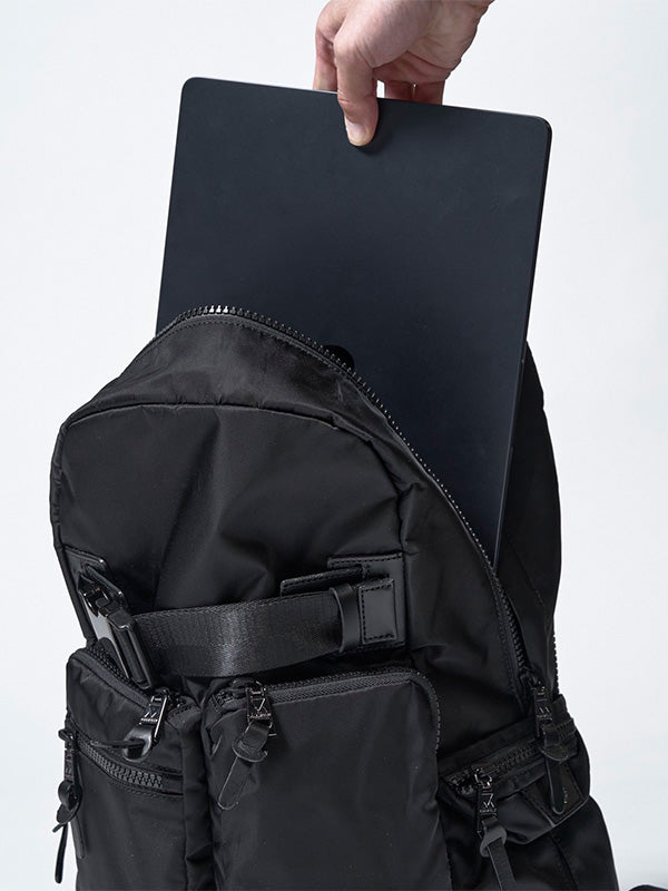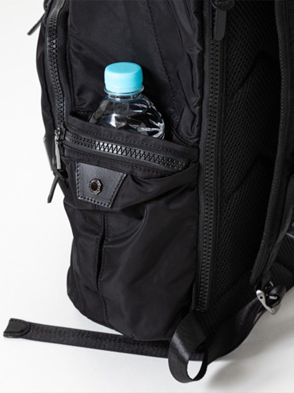 生地には弱撥水/防水性のある高密度ナイロンを使用。光沢があり高級感を演出します。メンズ・ウィメンズ問わずお使い頂けるバックパックです。