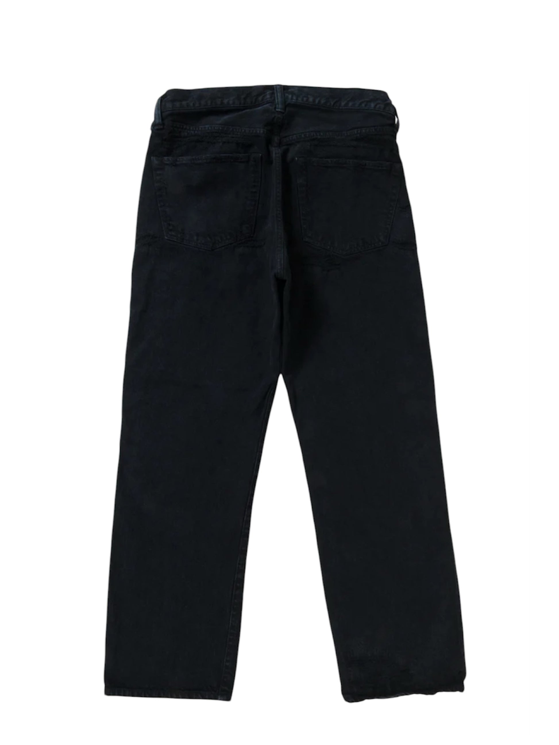 生地にはBEYONDEXXのホワイトデニム生地を使用し、デザイナー自身がリペアを繰り返しながら履きこんだデニムパンツのダメージとリペアを再現したデニムをブラックオーバーダイしたデニムです。