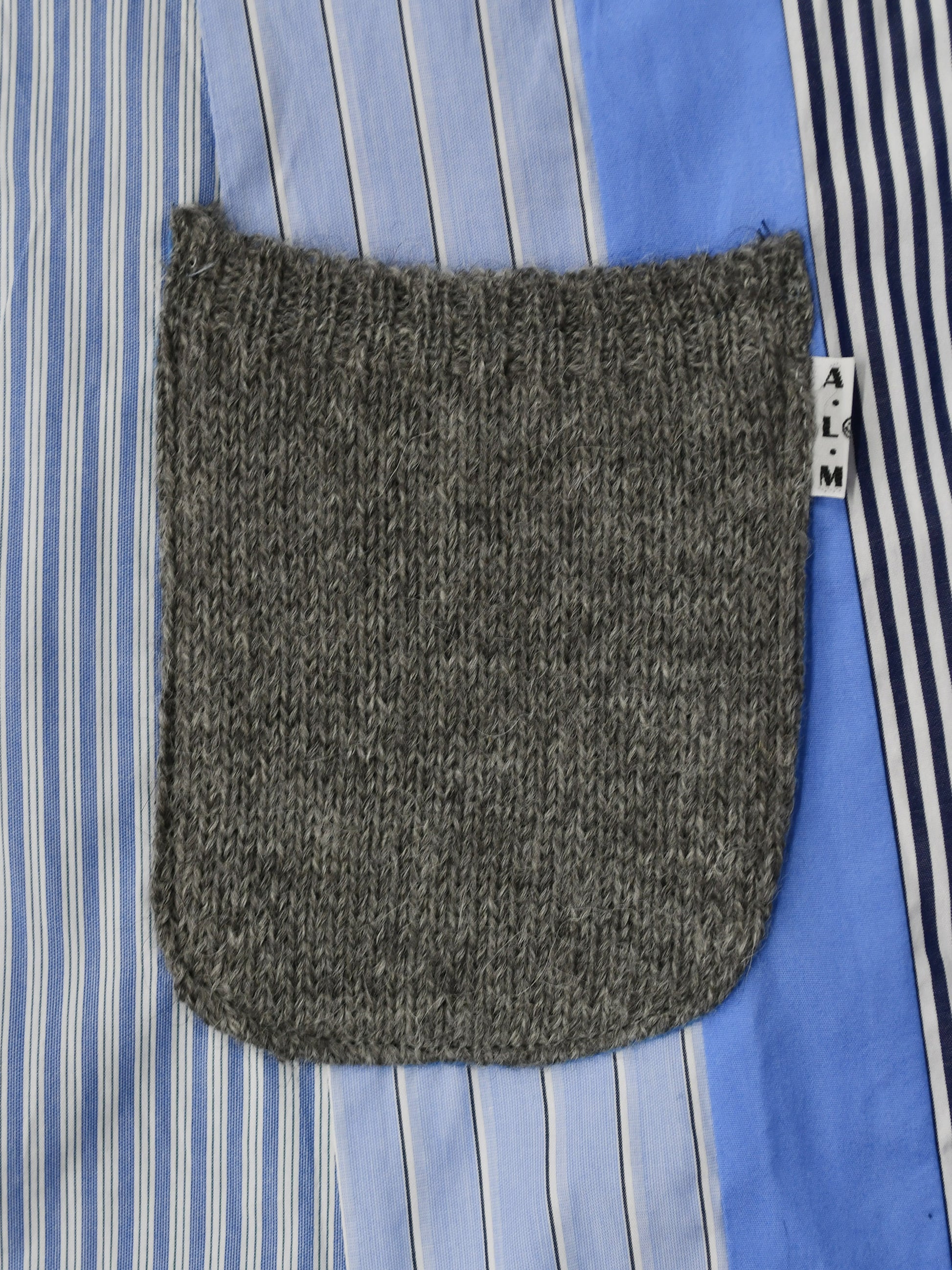 世界中からALMに集まるニットの試網見本や生地見本を一枚ずつ解体し可愛らしいポケットに形成。ストライプパッチワークシャツに一点一点取り付けています。サイズ&ポケットの色を併せてご確認のうえご検討下さい。