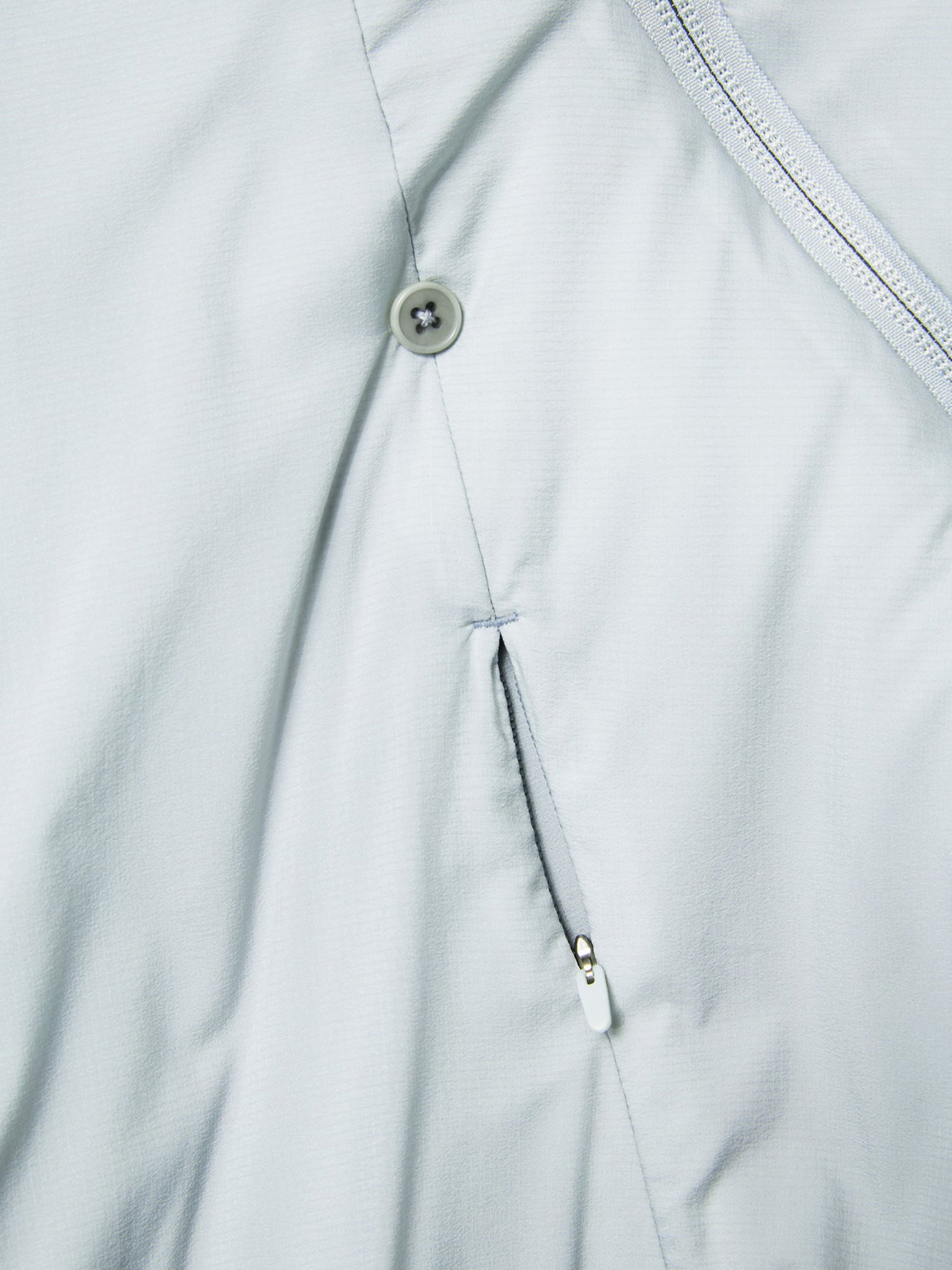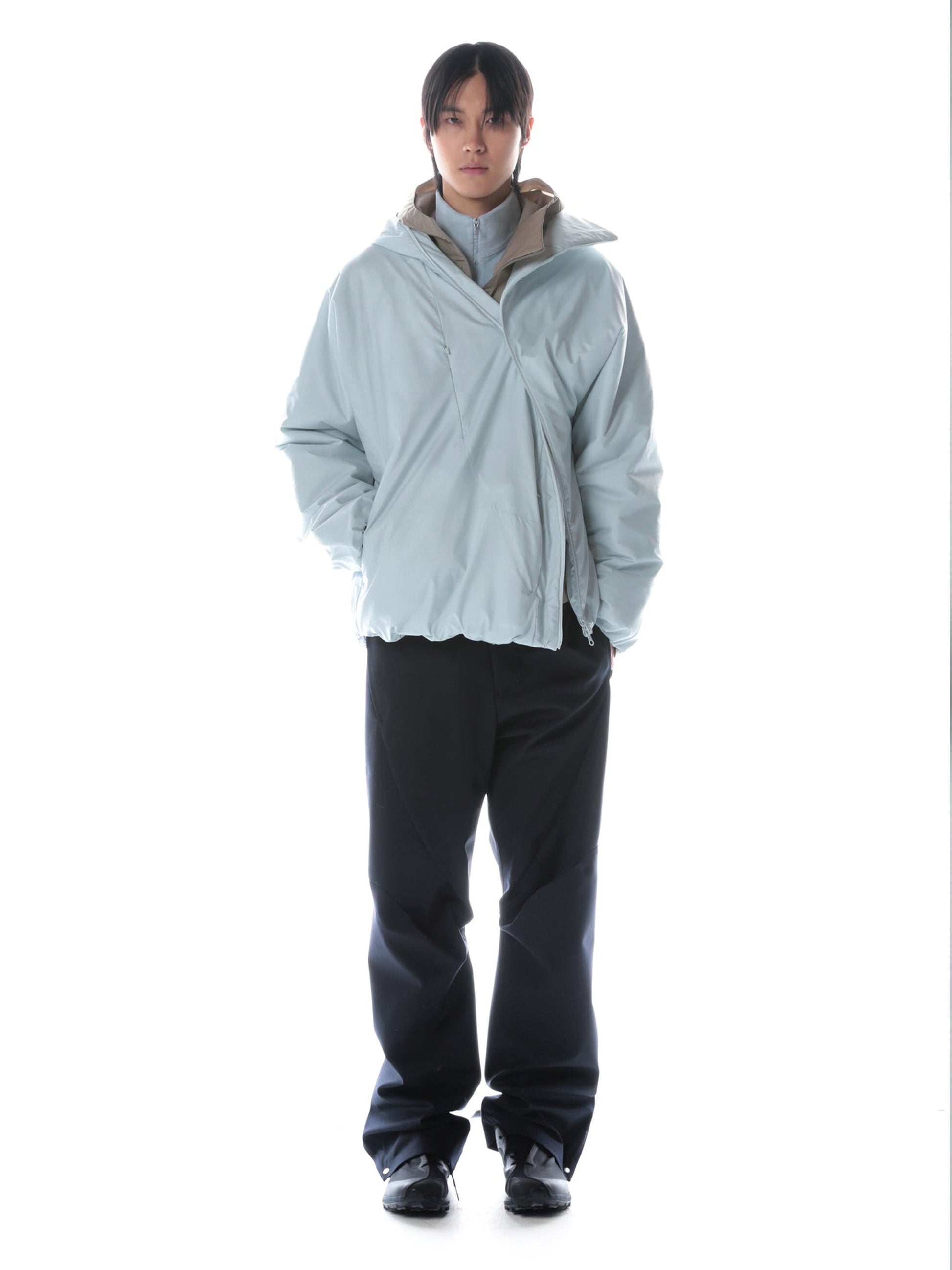 斜めのツーウェイフロントジッパーで構成され、フロントボタンが前身頃に配置。
