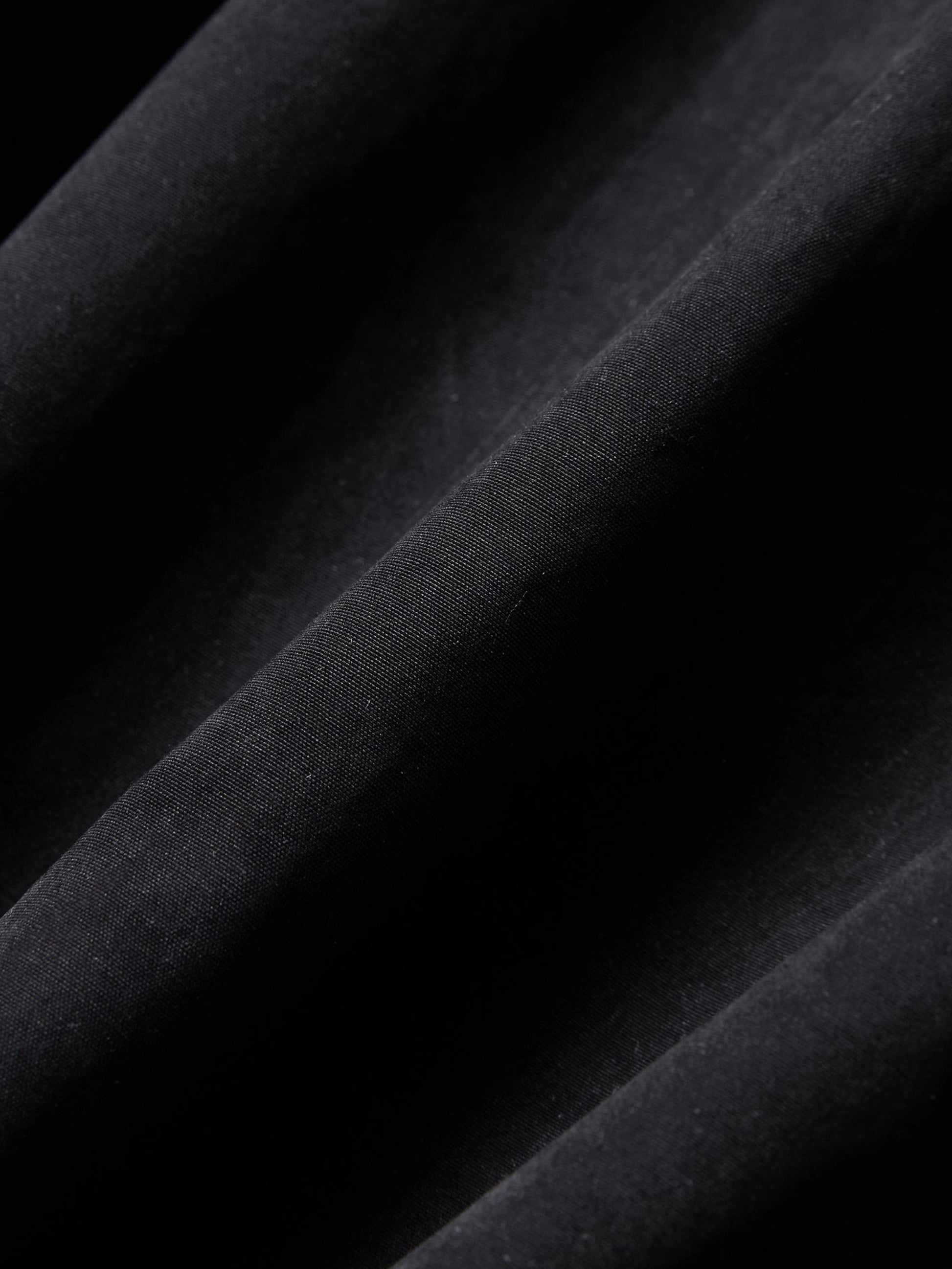 フロントは両開きジッパーとなっており、ウエストはドローストリングで調節可能。