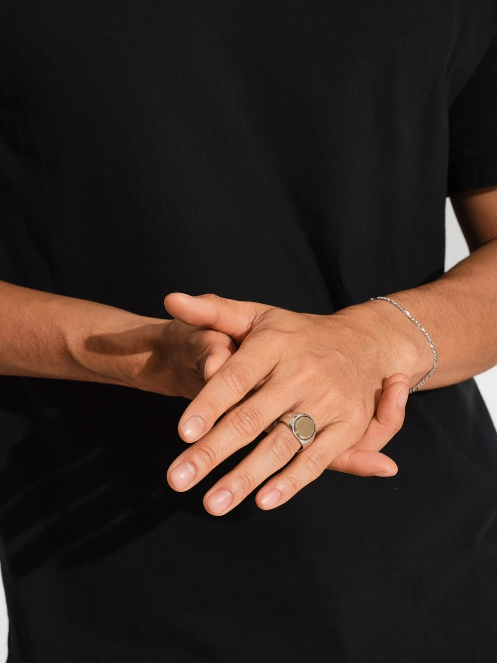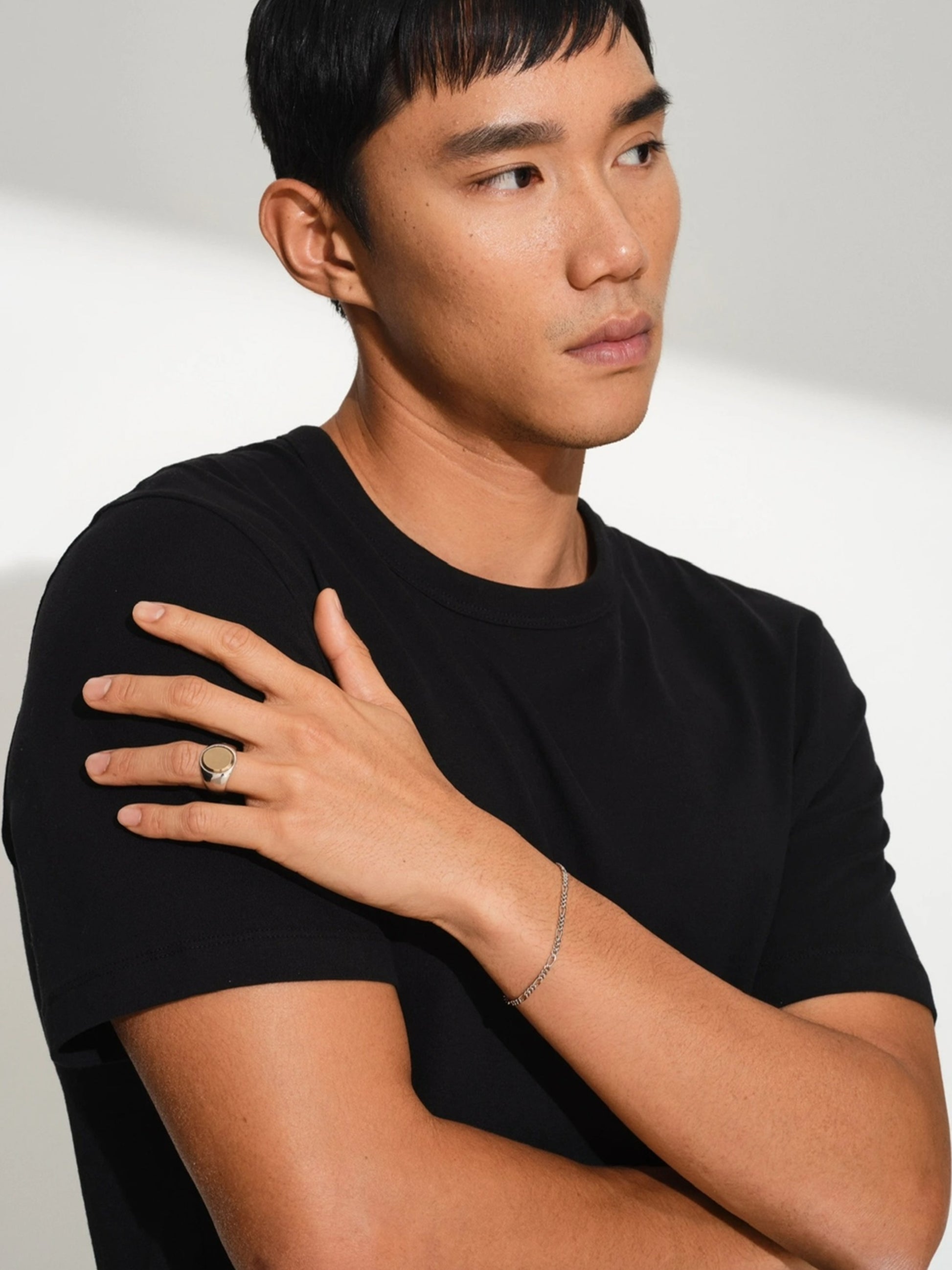 このブレスレットは、ポリッシュ仕上げのリサイクル・スターリングシルバー925製で、表面を強化し変色を防ぐためにホワイトロジウムプレーティングが施されています。
