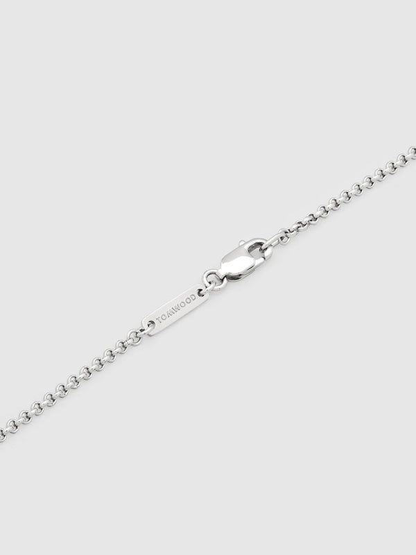 このネックレスはスターリングシルバー925製で、表面を強化し変色を防ぐためにホワイトロジウムプレーティングが施されています。
