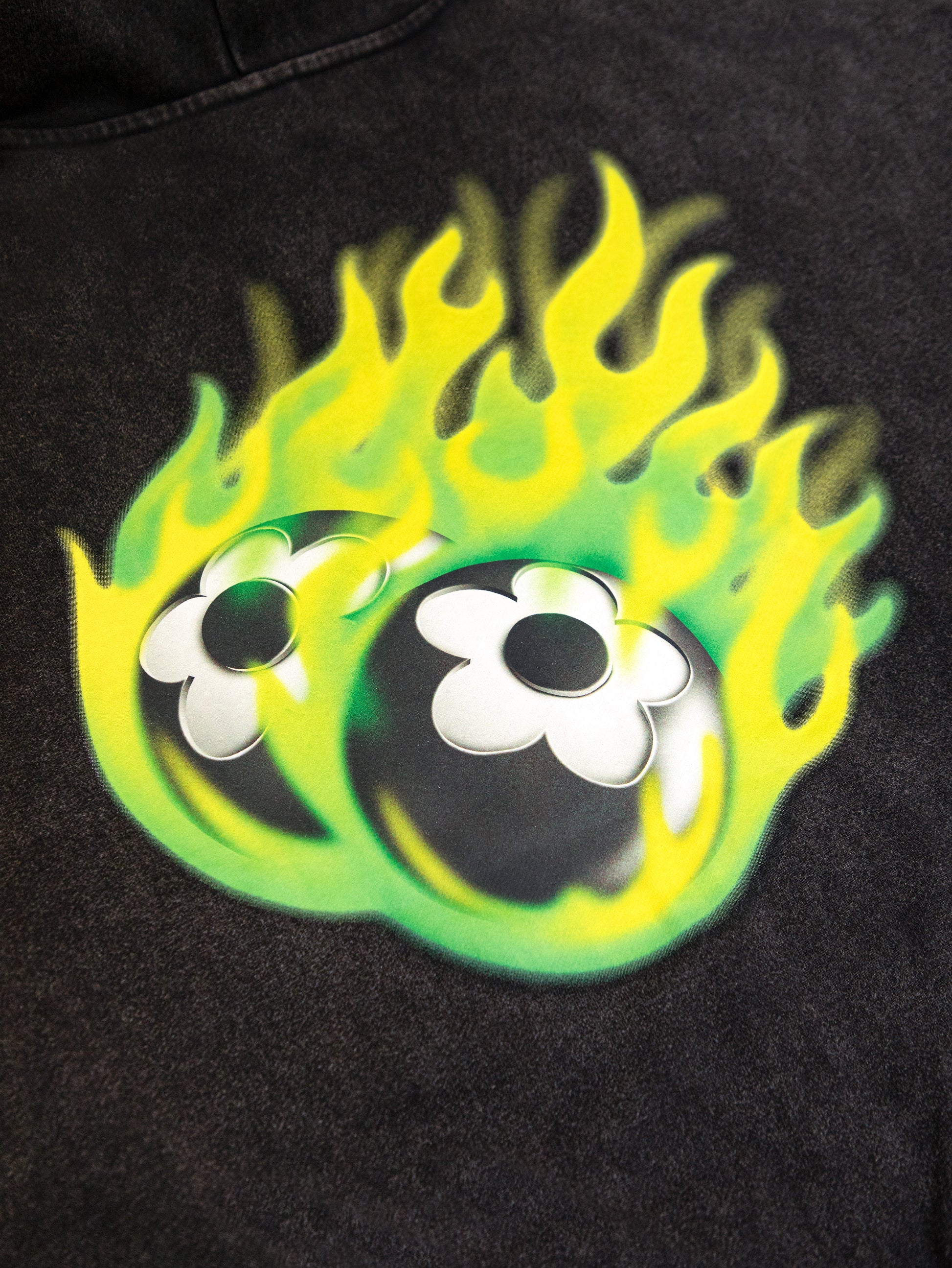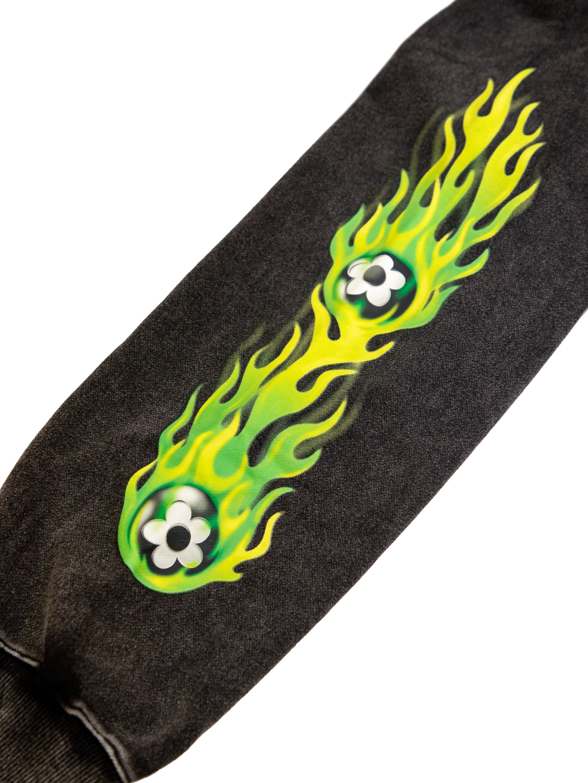 袖、背面には蛍光グリーンのファイヤーパターンのデザインがプリントされております。