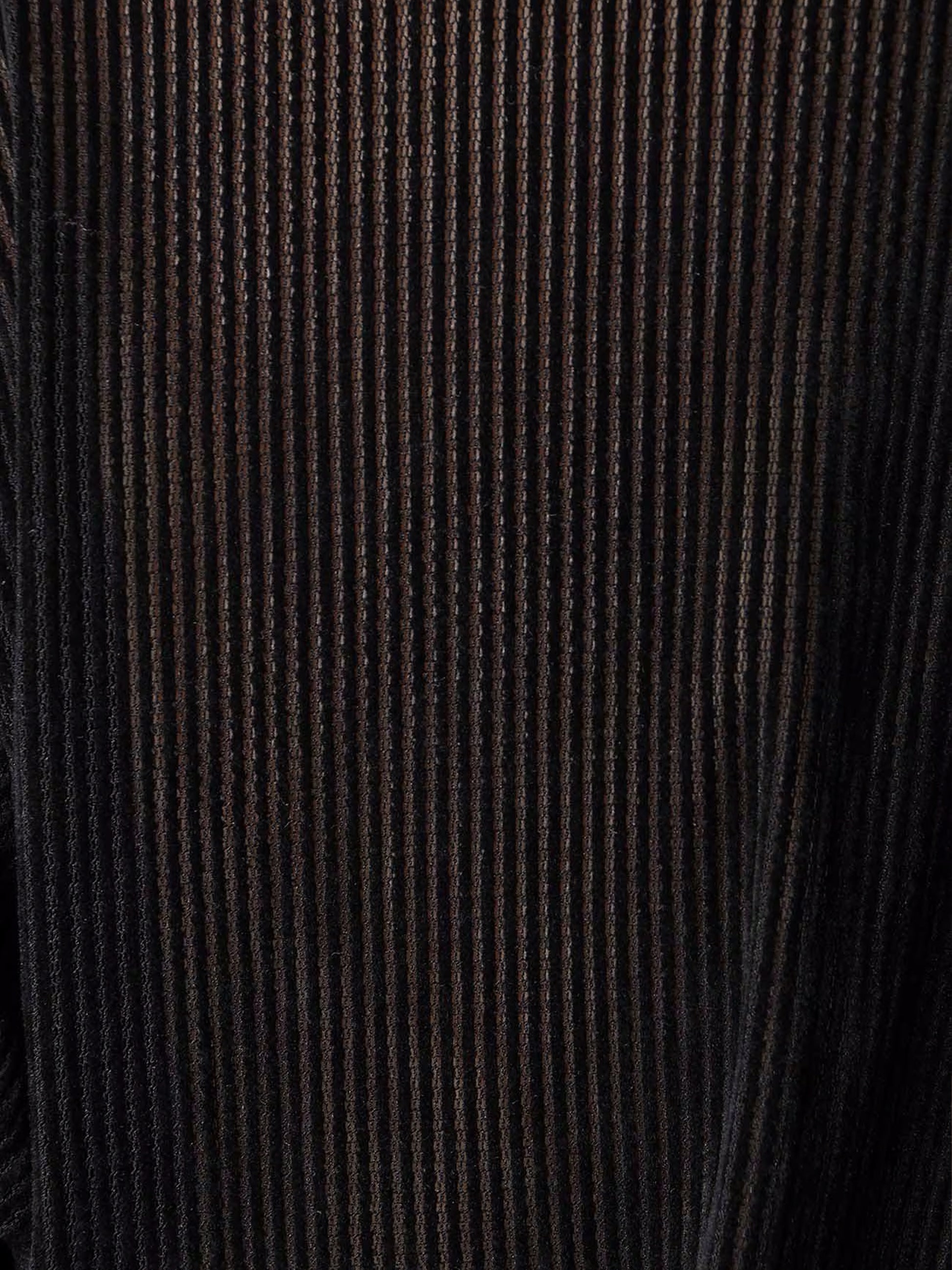 ストライプフロッキーの丸襟カーディガン。伸び感が良く、光沢による上品さを感じられる素材。ミニマムなシルエットと丸い襟がポイント。